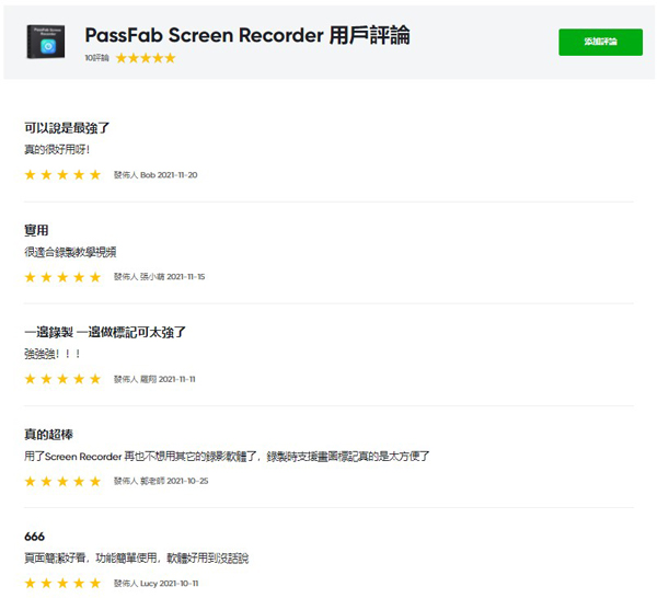 3. PassFab Screen Recorder值得推薦嗎?用戶們使用PassFab Screen Recorder 之後都一致給予好評,這款軟體真的非常好用!無論是老師、學生或者工作者都很適合使用,功能豐富操作也很簡單,而且還提供Macbook螢幕錄影的功能。另外,下面可以看到用戶們使用後都非常滿意,給予5星好評!