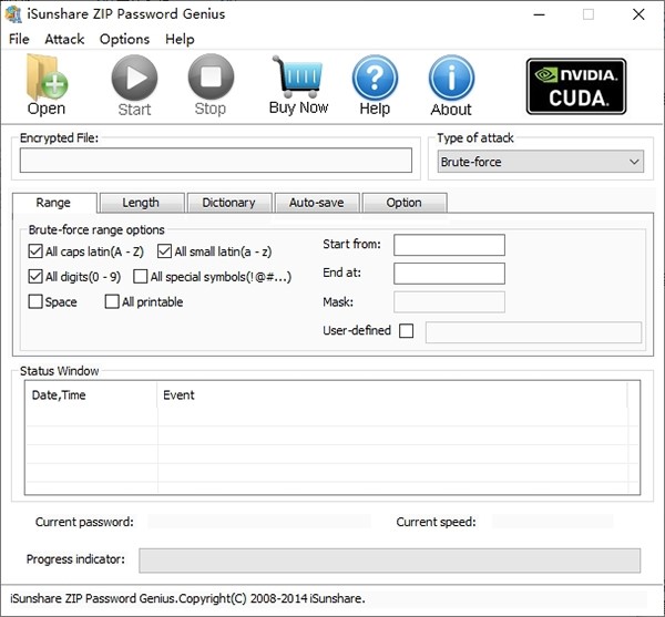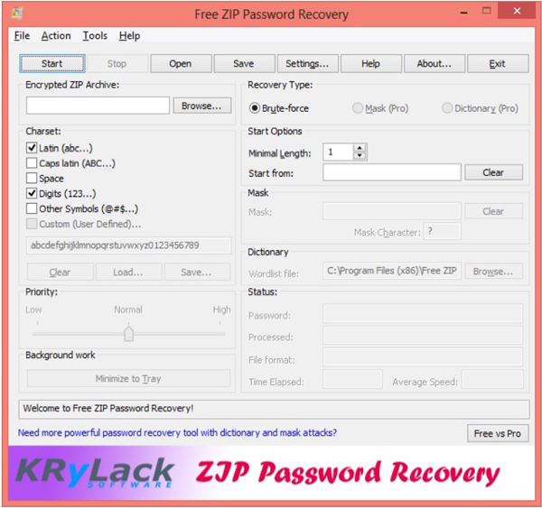 如果您想使用免費的方式來破解ZIP密碼的話,可以嘗試使用這款完全免費的ZIP密碼破解工具。軟體采用暴力破解的方法來找回丟失的密碼,此外您也可以自行設定密碼的長度、大小寫英文字母、數字等密碼信息,從而縮小密碼的搜索範圍。但是軟體並沒有提供操作説明,操作界面也較爲繁瑣,所以對於新手來説可能也不太友好。而且該軟體雖然是免費使用,但是破解速度相對來説也是比較慢的。