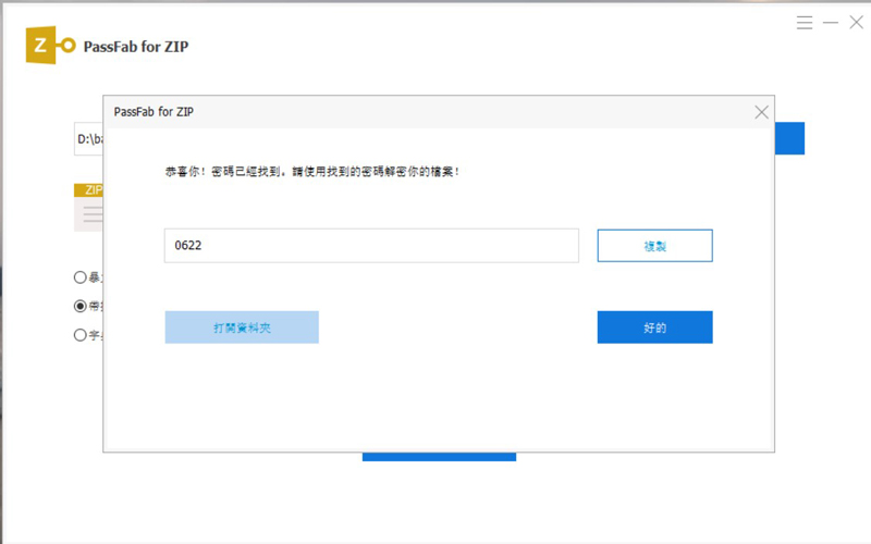 步驟3:我設定的壓縮檔密碼是0622,只需幾秒鐘就成功破解了!成功破解後操作界面上會顯示您的密碼,您可以直接點擊“複製”來解壓您的壓縮檔。