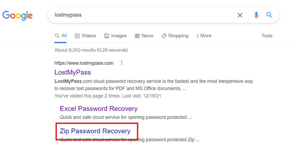 步驟1:在網路上搜索“LostMyPass”并且點擊“ZIP Password Recovery”進入網站。